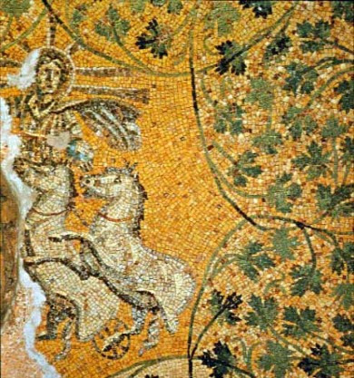 Mosaik des Christus als Sol Invictus(als unbesiegte Sonne). Deckengemälde in der vatikanischen Nekropole, - 3. Jahrhundert. Sol - Römische Mythologie. (Die Haare der Gestalt sind durch einen Mittelscheitel getrennt, was meistens auch auf den „Christusbildern“ zu sehen ist.)