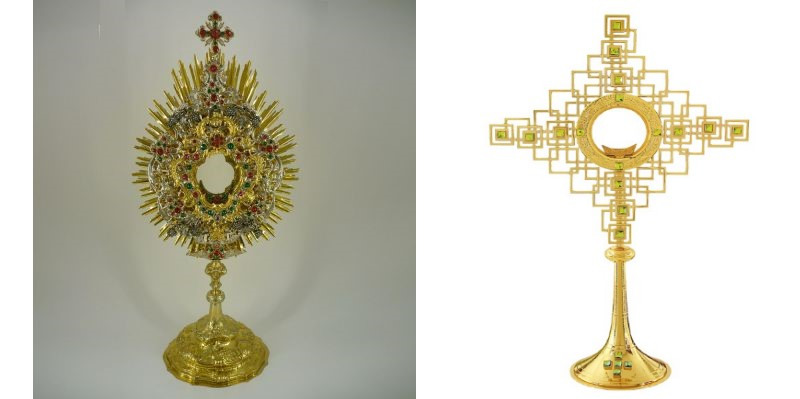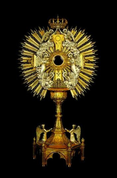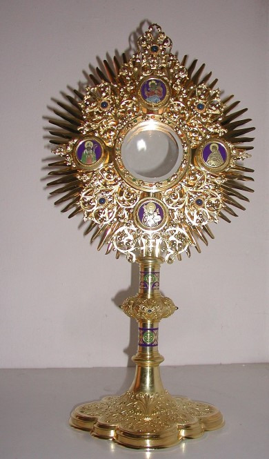 Eine Monstranz (lat. monstrare „zeigen“) ist ein kostbares mit Gold und oft auch mit Edelsteinen gestaltetes, liturgisches Schaugerät mit einem Fensterbereich, in dem eine konsekrierte (geweihte) Hostie zur Verehrung und Anbetung feierlich gezeigt wird.