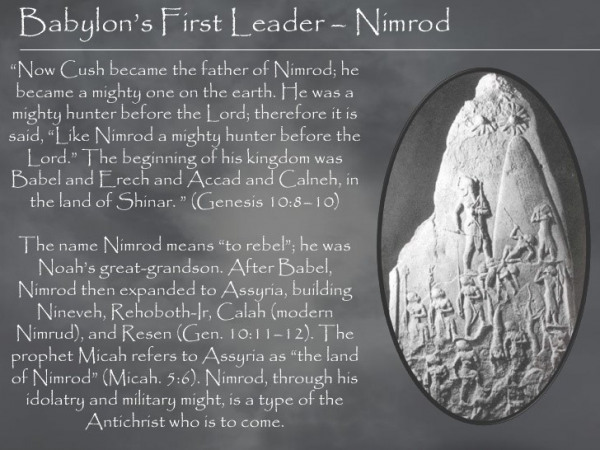 Der Name Nimrod bedeutet "Rebell"; er war Noahs Urenkel. Nach Babel erweitert Nimrod dann sein Reich nach Assyrien, baute Ninive, Rehoboth-Ir und Kelach, (modernes Nimrud), bis nach Resen (Gen. 11-12). Der Prophet Micha bezieht sich auf Assyrien als "das Land Nimrod" (Micha 5, 6). In Nimrods Götzendienst und militärischer Macht zeigt sich die Natur des Antichristen, der noch kommen wird.