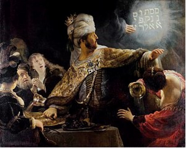 Im fünften Kapitel des Buches Daniel wird die Geschichte des babylonischen Statthalters und Kronprinzen Belsazar erzählt. Der trunkene Prinz lässt sich im Übermut die wertvollen Opfergefäße bringen, die Nebukadnezar aus dem Tempel in Jerusalem mitgenommen hatte. Belsazar und seine Gäste trinken aus diesen Gefäßen und lobten die heidnischen goldenen, silbernen, bronzenen, eisernen, hölzernen und steinernen Götter.